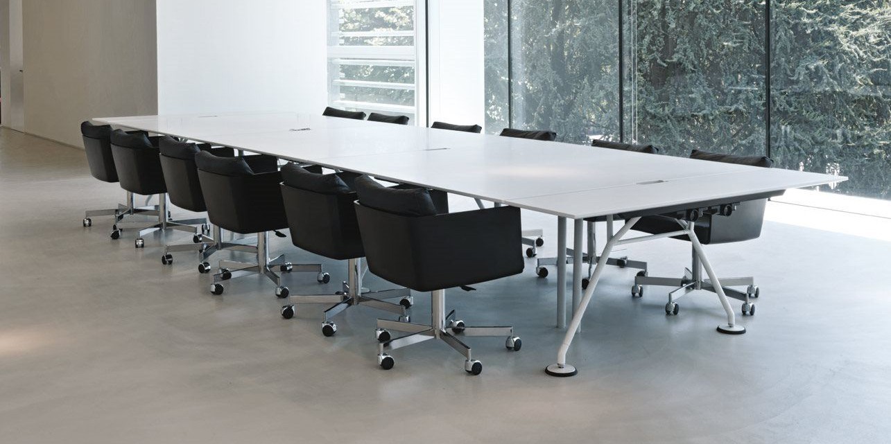 Table de réunion en verre. Nomos, icône reconnue de la conception industrielle, est un produit polyvalent et extrêmement résistant, capable de tirer un profit maximal des caractéristiques de qualité de la structure et des bases tubulaires métalliques et en aluminium.